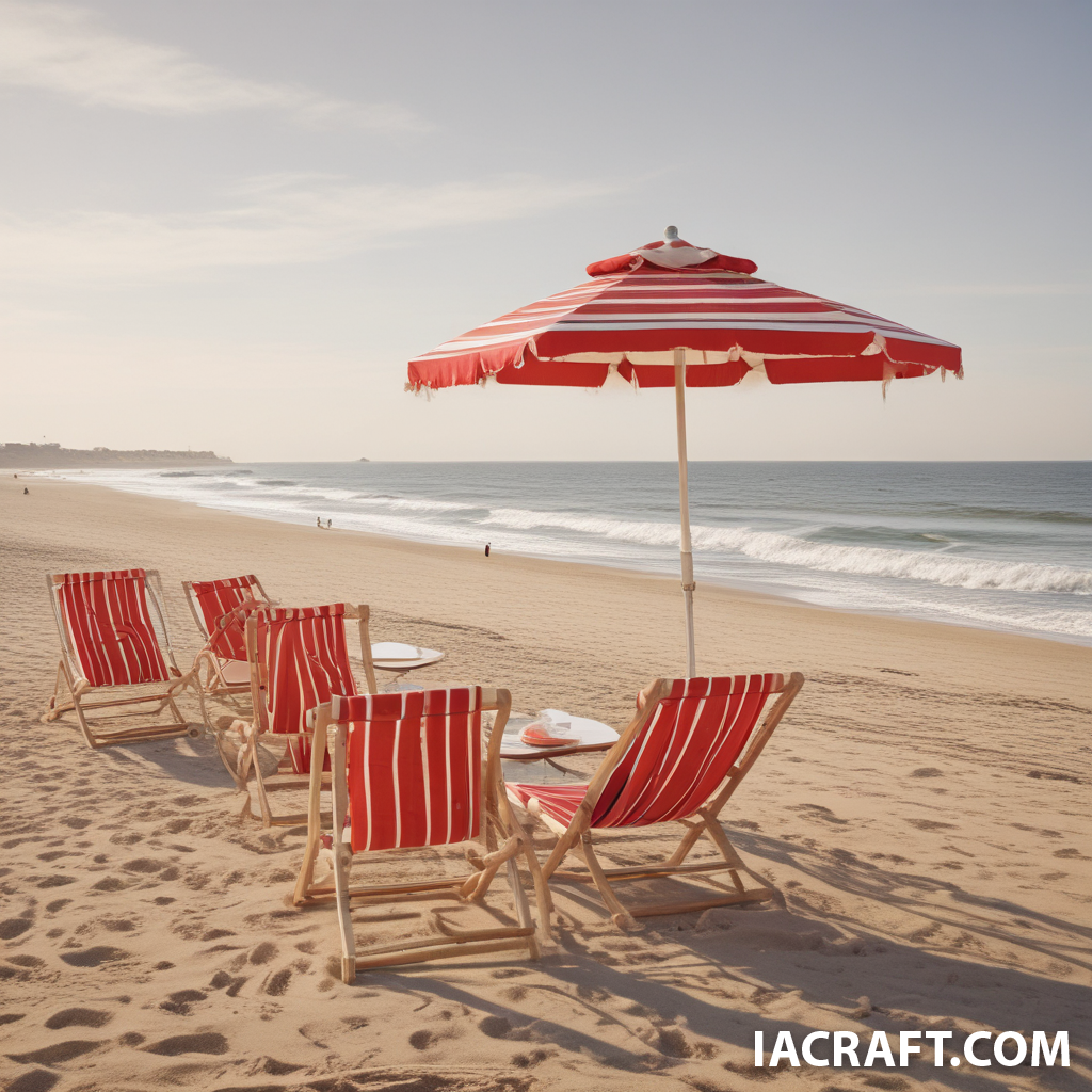 prompt: Luxury beach club setup in Punta del Este, Uruguay — beige and red striped beach towels, elegant umb...