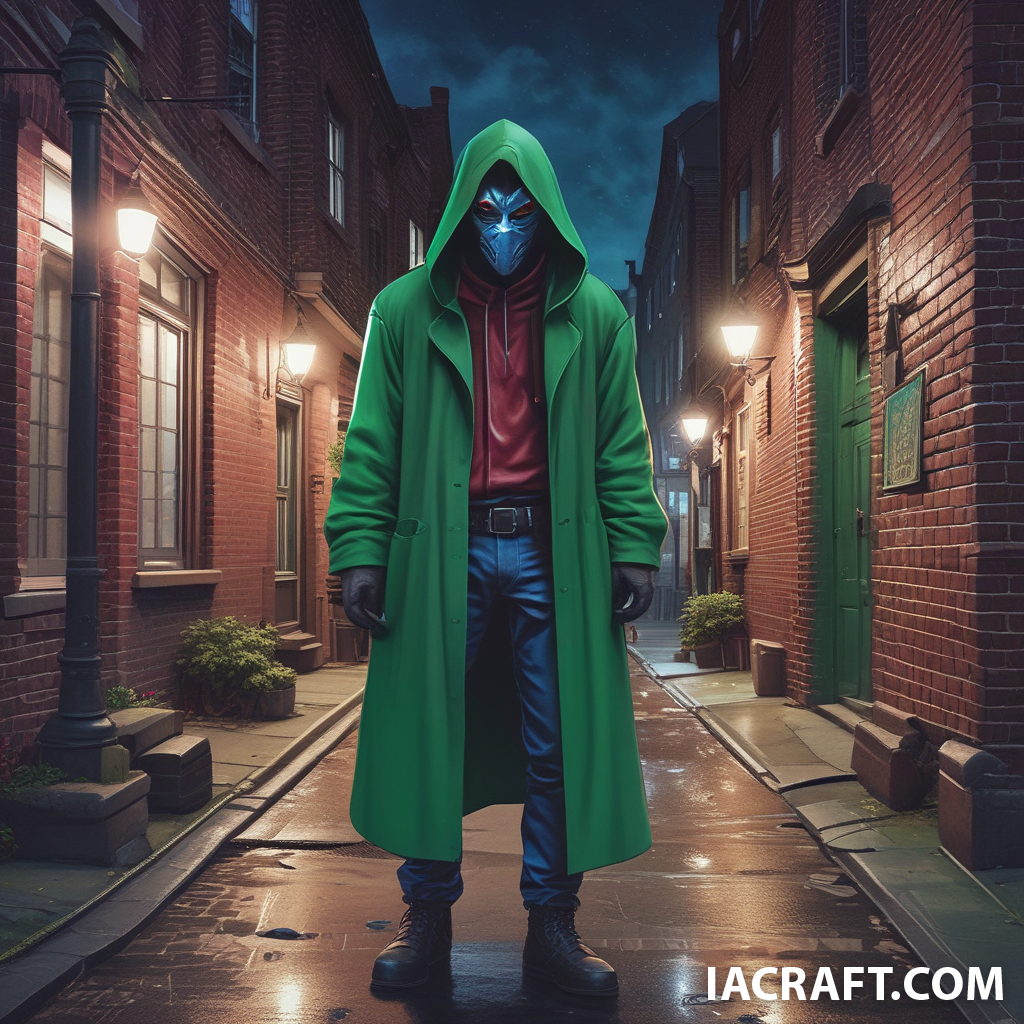 prompt: Pendant la nuit dans une ruelle d'une petite ville, un homme avec un manteau en cuir bordeaux et une...