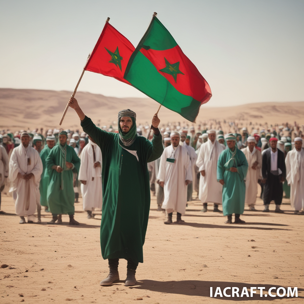 prompt: a lot of moroccan men of sahrawi origin ,in the desrt,holds the moroccan flag in his left hand nd th...