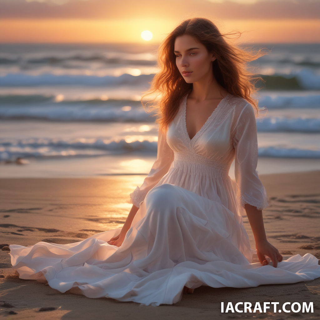 prompt: Crée une photo hyperréaliste d'une jeune femme en robe d'été légère, assise sur une plage au coucher...
